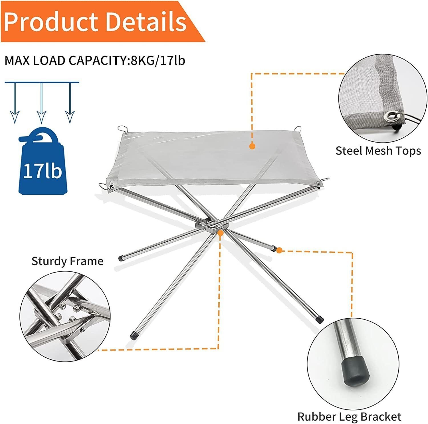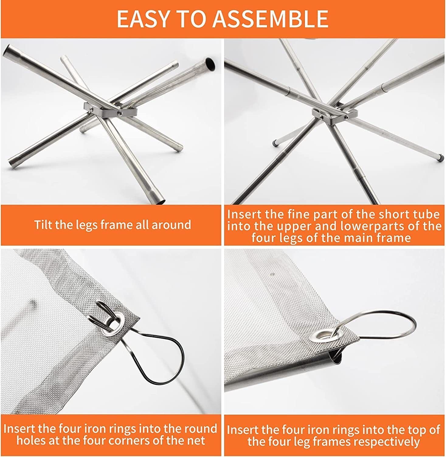 Features: 1.Our collapsible fire pit is 0.96mm 304 stainless steel heat resistant mesh, carefully woven to limit the sliding of ashes and debris. 2.Four crisscrossing stainless steel heat resistant stands form the most stable triangle, each with a black rubber base.
